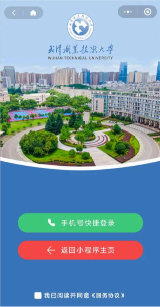 扫码进入或微信搜索“武汉职业技术大学校友会”小程序,首页或服务大厅-点击 “ 校友卡申领 ” (手机号快捷登录 )