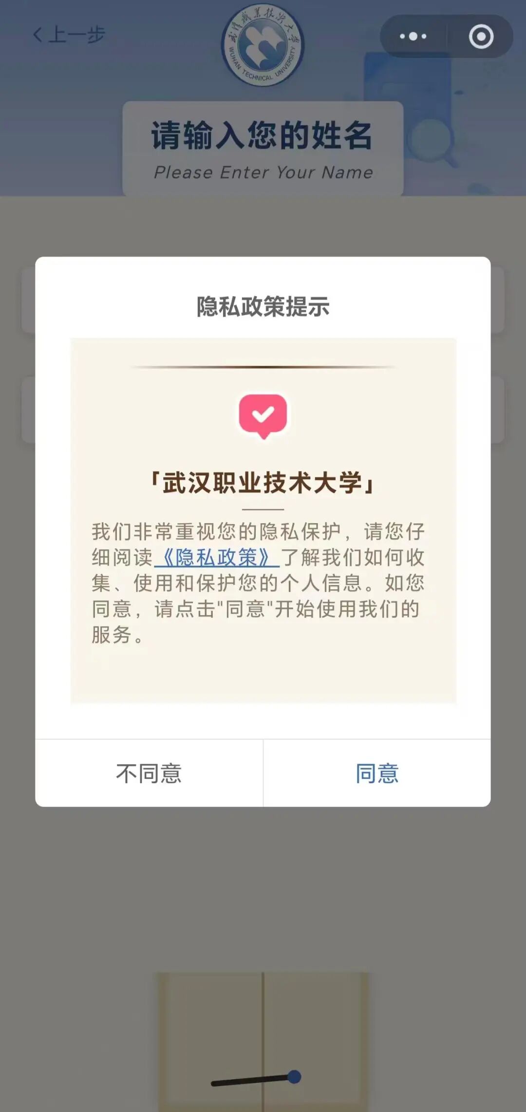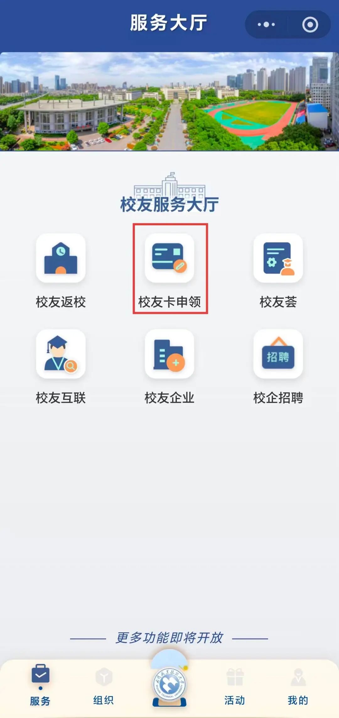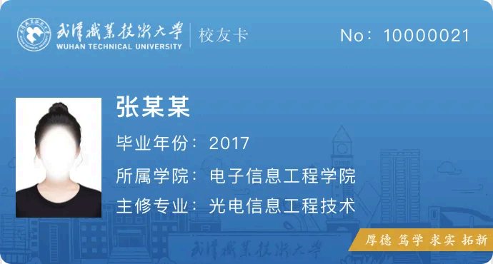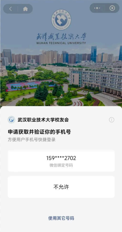扫码进入或微信搜索“武汉职业技术大学校友会”小程序,首页或服务大厅-点击 “ 校友卡申领 ” (手机号快捷登录 )