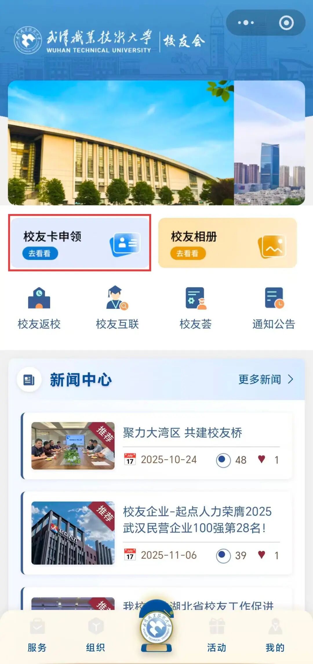想要体验更多校友专属服务吗?那就赶快来小程序完成认证,领取校友卡吧!