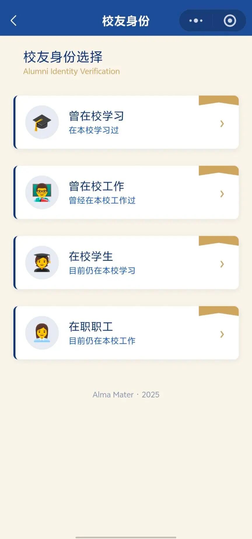 进入手动校友认证页,选择对应校友身份-填写相关信息进行认证(请按照提示填写真实信息⼀步步进行操作),提交认证等待审核。(请耐心等待审核,审核通过后微信中会收到服务通知)